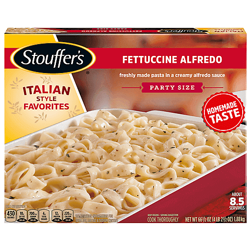 Stouffer's Party Size Fettuccine Alfredo frozen meal combines quality ingredients and delicious flavor into one quick dinner. Featuring freshly made pasta in a creamy Alfredo sauce, this Stouffer’s Alfredo frozen dinner is sure to satisfy every taste bud. This Italian Style Favorites Alfredo pasta frozen entree is made with Parmesan, Asiago and Romano cheeses and contains no preservatives. Party Size Stouffers Fettuccine Alfredo frozen dinners contain about 8.5 servings for an easy-to-prepare party size entree that is equal parts delicious and filling. Enjoy these frozen dinners when you want a dish with homemade taste. Prepare this Stouffer's frozen pasta dinner in the oven at 400 degrees for 65 minutes from frozen or for 45 minutes when thawed for an easy dinner on weeknights. Add your own toppings, such as grilled chicken or spinach before serving; just stir and enjoy. Each box contains one party size frozen dinner. Keep Stouffer's Party Size Fettuccine Alfredo frozen entree frozen until ready to enjoy.